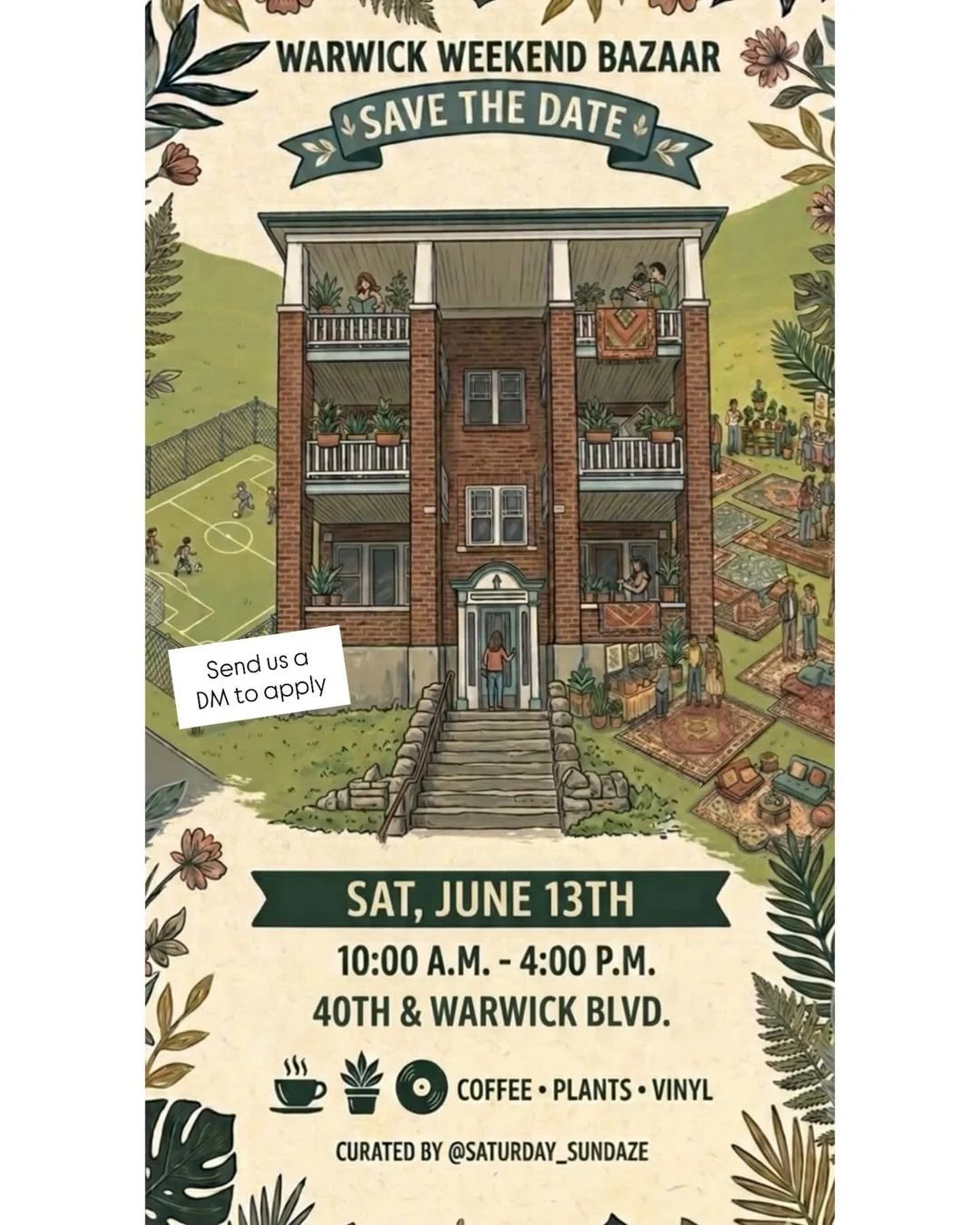 Back to All Events Warwick Weekend Bazaar Saturday, June 13, 2026 10:00 AM 4:00 PM E 40th St & Warwick Blvd Kansas City, MO, 64111 United States (map) Google Calendar ICS Join Kansas City’s hottest new neighborhood pop up experience this summer at Warwick Weekend Bazaar, happenging Saturday, June 13 from 10 a.m. to 4 p.m.
